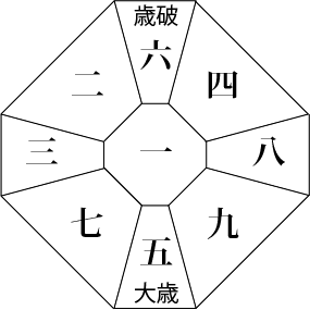 | 五黄土星 | 二黒土星、六白金星、七赤金星、八白土星、九紫火星 |